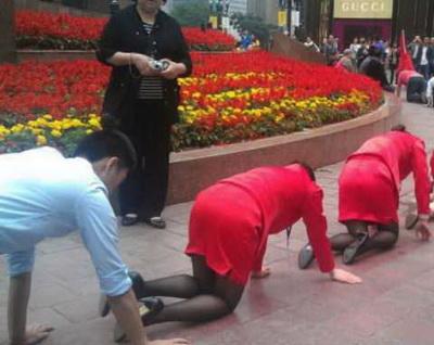 Энэ тавдугаар сарын 2-нд хятадын Чунцин хотын оршин суугчид нэг сонин үзэгдлийн гэрч болжээ. Улаан өнгийн хувцастай эмэгтэйчүүд, хар өмд, цайвар өнгийн цамцтай насанд хүрсэн эрчүүд гэгээн цагаан өдөр олны нүдэн дээр гудамжаар дөрвөн хөллөөд мөлхөж байхыг харсан хүнд юу бодогдох вэ. Нэгэн байгууллагын үүдний талбай дахь хөшөө,